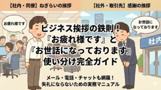 ビジネスシーンで毎日のように使う挨拶である「お疲れ様です」と「お世話になっております」。どちらも丁寧で無難な表現ですが、使う相手や場面を間違えると違和感を与えたり、失礼に受け取られることもあります。本記事では、それぞれの意味や敬語レベルの違...
