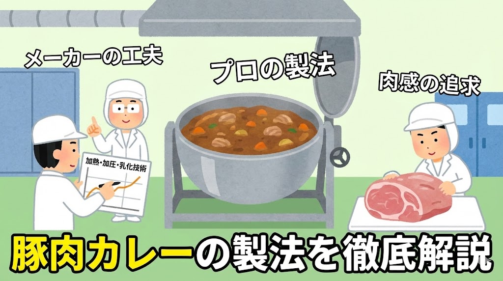 市販の豚肉カレーは、家庭調理とは大きく異なる工業的かつ再現性の高い製法によって作られており、肉の存在感とソースの一体感を高いレベルで両立させています。家庭では火加減や材料の状態によって仕上がりにムラが出やすいのに対し、メーカー製造では温度・圧力・攪拌(かくはん)・加熱時間などが厳密に管理され、毎回同じ味・同じ肉感を再現できるのが大きな特徴です。