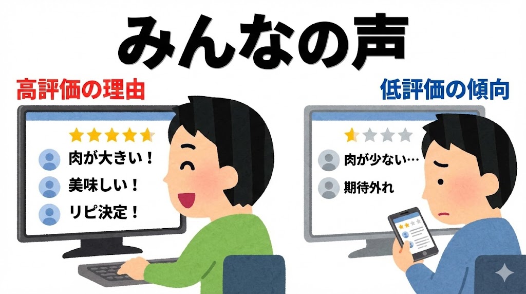 実際の購入者レビューは、商品説明だけでは分からないリアルな食体験を知るための貴重な情報源です。特に、味・肉感・コストパフォーマンスといった要素は、公式情報よりもレビューの方が具体的で、購入後の満足度をイメージしやすくなります。