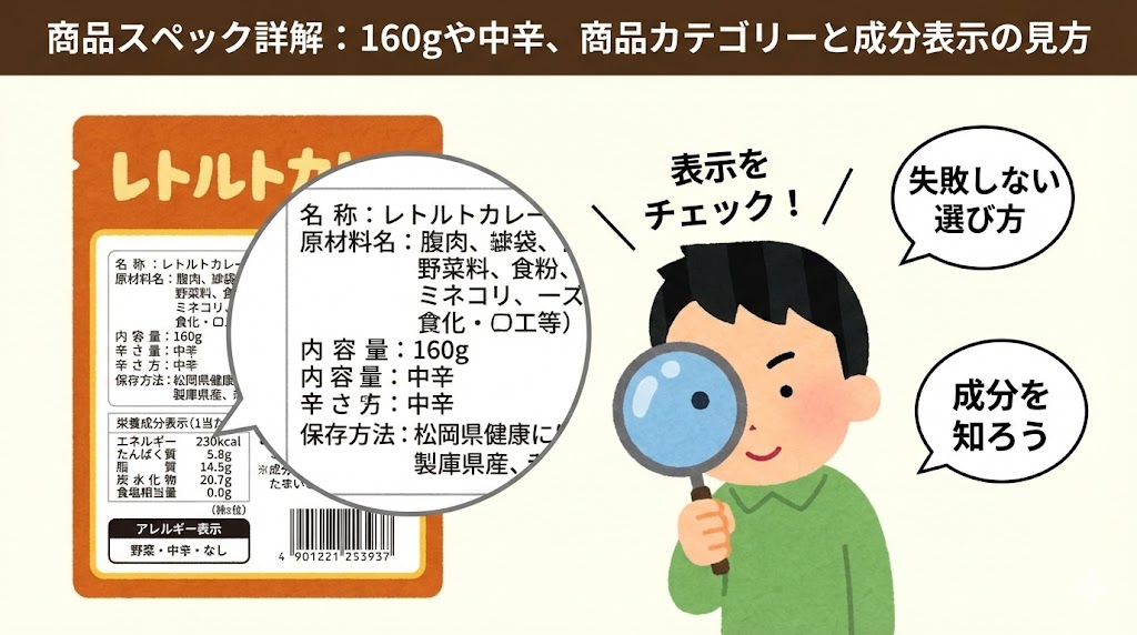 商品スペック詳解:160gや中辛、商品カテゴリーと成分表示の見方