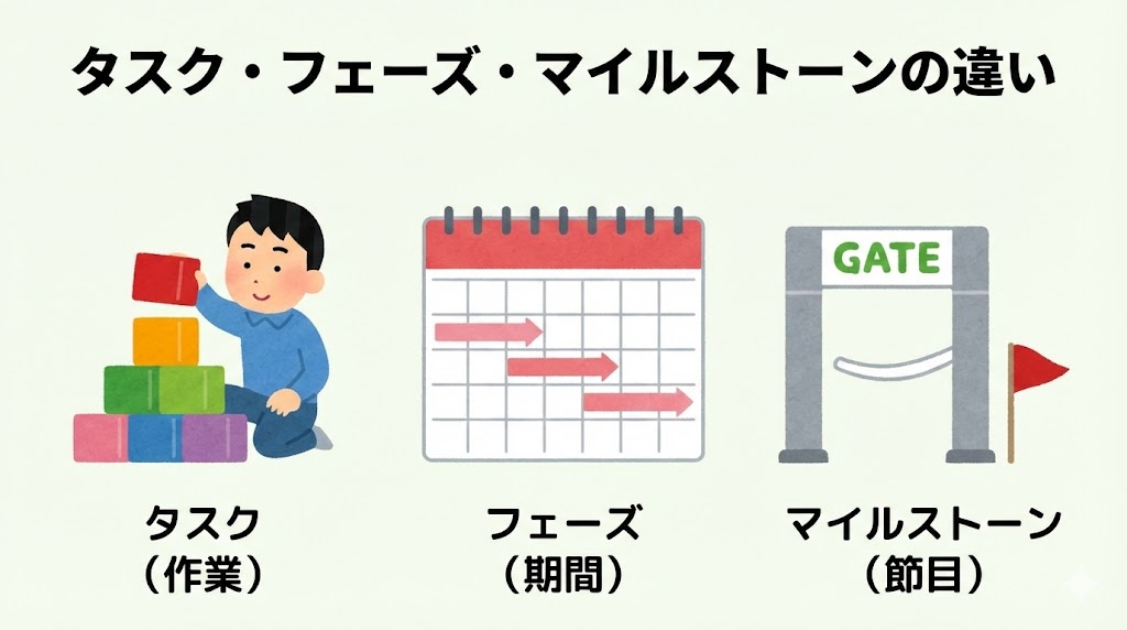 何となく「節目」や「中間目標」というイメージはあっても、タスクやフェーズとの違いを正確に説明できる人は意外と多くありません。