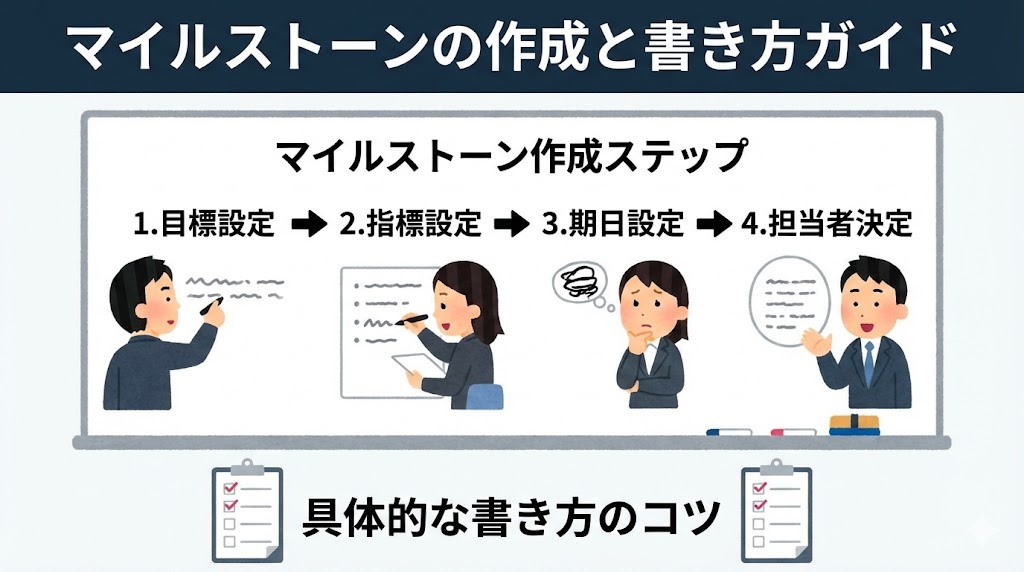 マイルストーン作成のステップ:目標設定→指標→期日→担当者決定