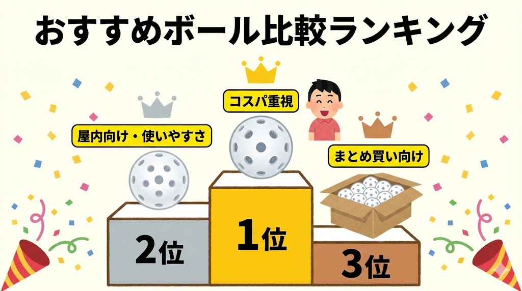 ランキング形式という表現ではありますが、特定の商品名ではなく、どのようなタイプのボールが初心者に向いているかという観点で整理しています。