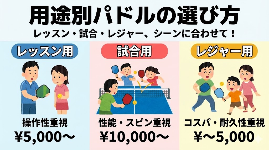 用途別の選び方:レッスン用・試合用・レクリエーション別の最適パドルと価格帯