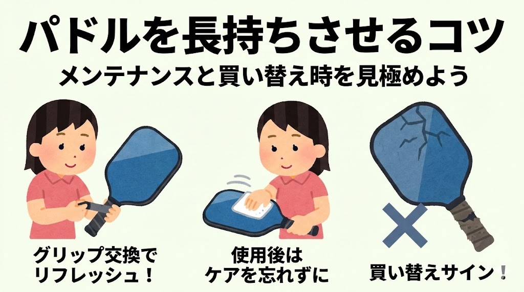 また、「以前よりボールが飛ばなくなった」「打球感が極端に変わった」と感じた場合も、パドル性能が低下している可能性があります。こうした変化を感じたら、早めに買い替えを検討することで、プレーの質を維持できます。