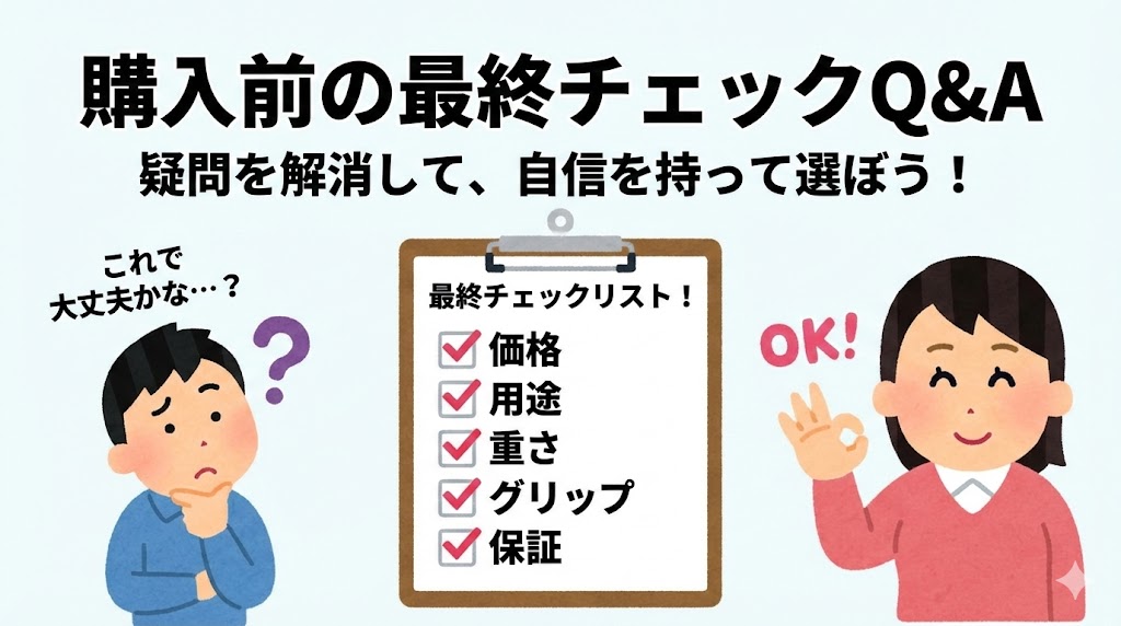 ここでは、ピックルボールパドルを購入する前に多くの人が感じる疑問や不安を整理し、最終確認として役立つチェックポイントをまとめます。購入直前にこの項目を見直すことで、「思っていたのと違った」「選び方を間違えた」といった後悔を大きく減らすことができます。