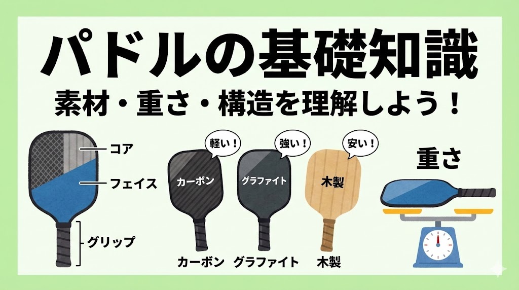 ピックルボールパドルは、見た目が似ていても素材・重さ・形状によって打球感や操作性が大きく異なります。初心者が適当に選んでしまうと、「思ったより重い」「コントロールしにくい」「すぐに疲れる」といった不満につながりやすくなります。まずは基礎知識を押さえることで、自分のレベルやプレースタイルに合ったパドルを選びやすくなります。