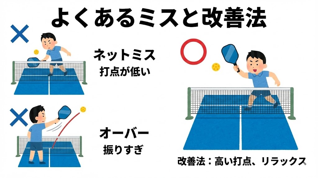 - ネットミス:打点が低い → もっと高い位置で打つ