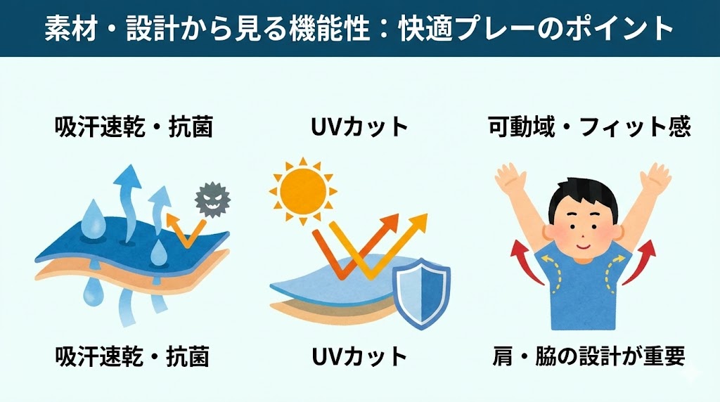 また、屋外でのプレーが多い場合は、UVカット機能付き素材を選ぶことで、紫外線による肌ダメージを軽減できます。長時間日差しを浴びると、日焼けだけでなく体力消耗にもつながるため、UV対策は快適さと健康の両面で重要なポイントです。