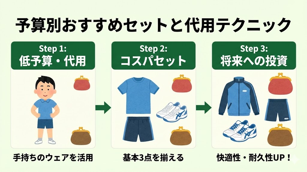 機能Tシャツ+軽量ショーツ+コート対応シューズの3点セットが、初心者の基本構成です。この構成で、室内・屋外の多くの環境に対応でき、無駄のないスタートが可能になります。