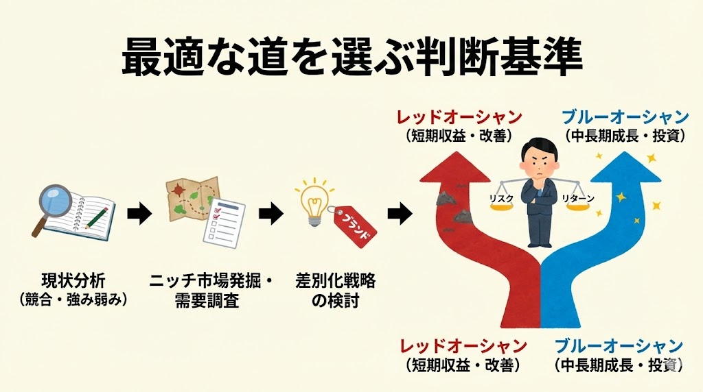 レッドオーシャンに留まるべきか、ブルーオーシャンを狙う余地があるかが見えてきます。