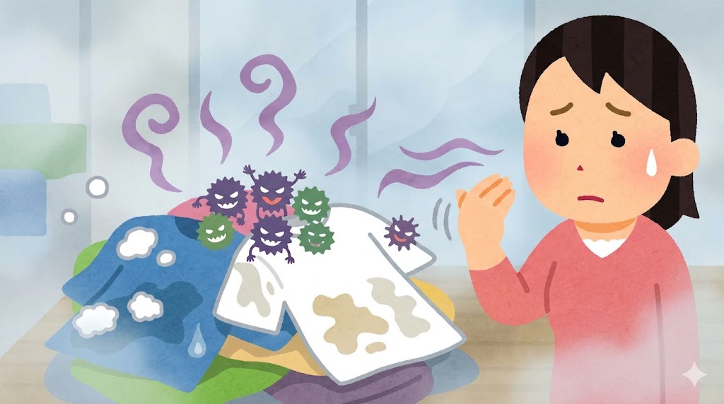 また、一度発生した臭いは繊維に定着しやすく、通常の洗濯では落ちにくくなります。