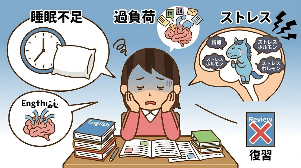 - 緊張・ストレス:プレッシャーが強いと集中力が分散し、記憶効率が下がります。