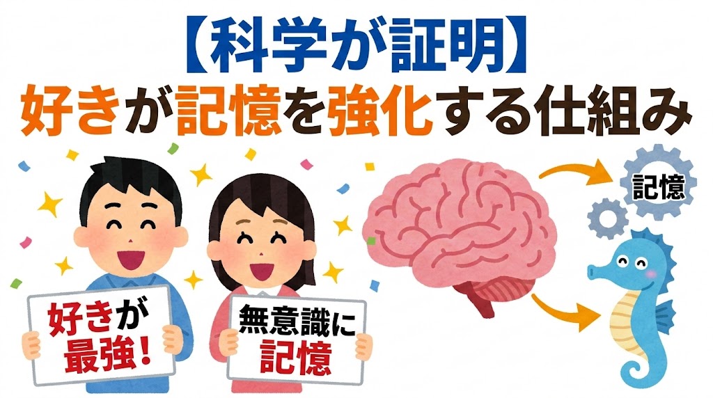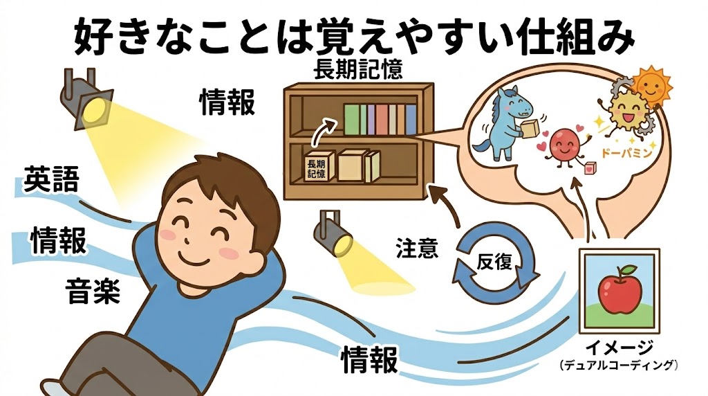 好きな情報は自然と繰り返し触れるため、海馬での固定化が進みやすいのです。