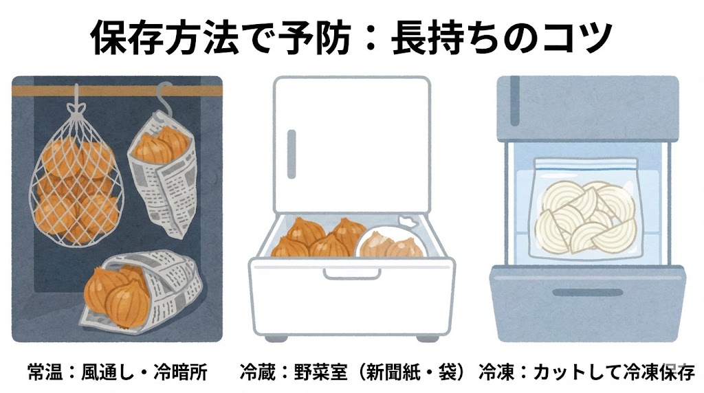 玉ねぎを長持ちさせるためには、まず風通しの良い冷暗所で保存することが基本です。