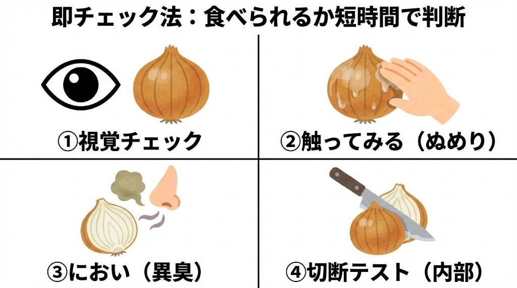 玉ねぎを見極める際の実践的なチェックポイントは、硬さ・臭い・ぬめりの3点です。
