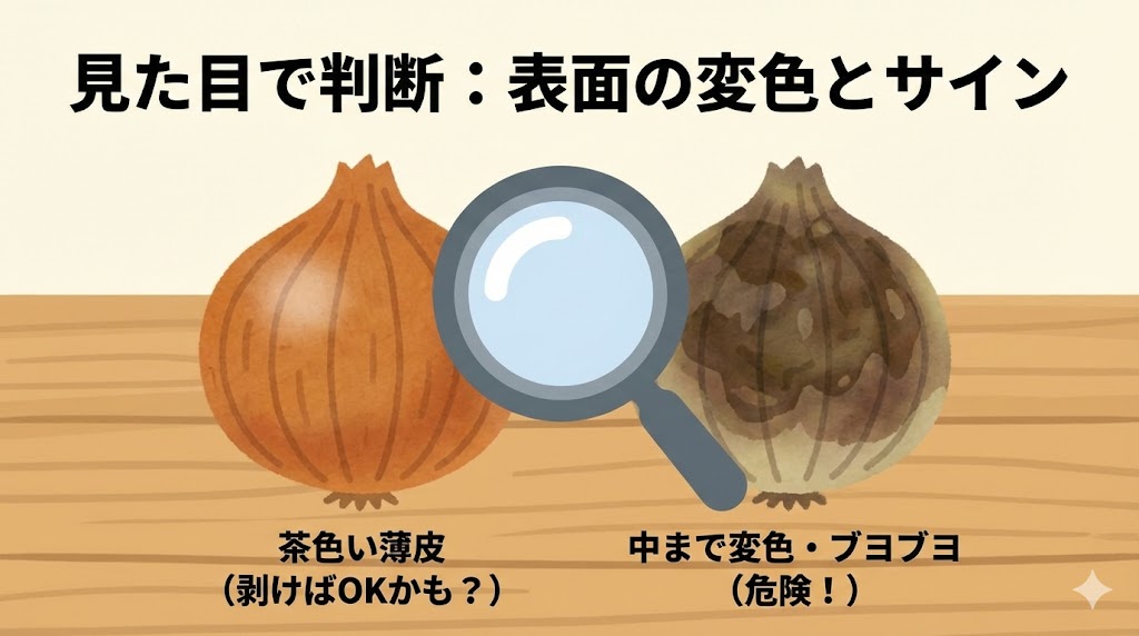 まずは玉ねぎの外側をよく観察し、変色が一部だけか、全体に広がっているかを確認します。
