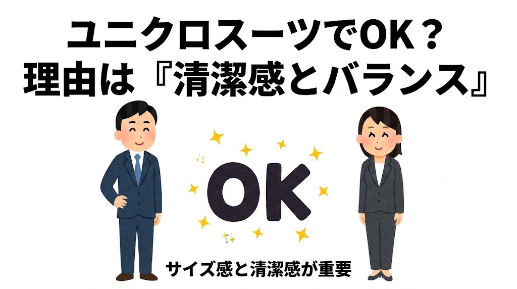 この3つを満たしていれば、ユニクロスーツであっても十分対応可能です。不安がある場合は、第三者に見てもらうのも有効です。