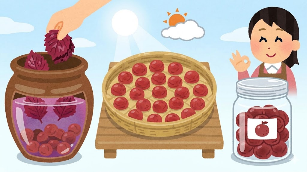 特に赤紫蘇の投入や天日干しは、見た目と風味を左右する大切な工程です。