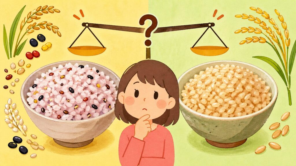 手軽さや食べやすさを重視するなら雑穀米、栄養密度や健康効果を重視するなら玄米というのが基本的な選び方です。